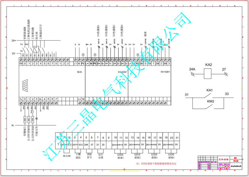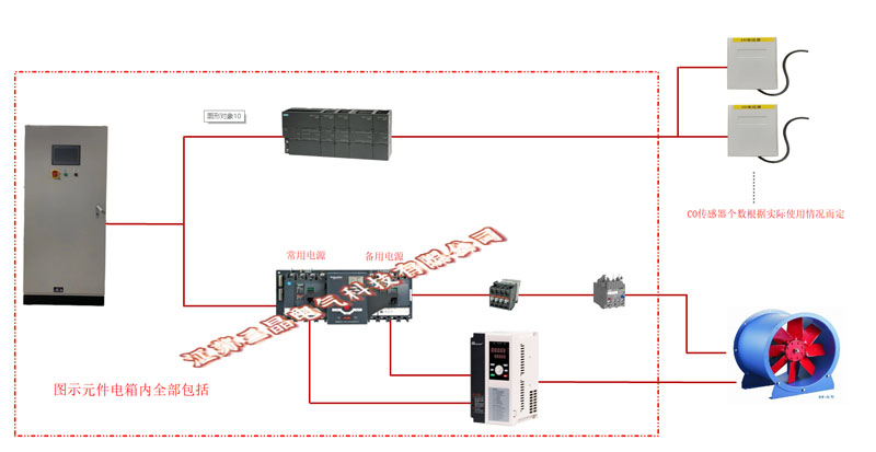 開機(jī)后根據(jù)空氣中的CO(一氧化碳)含量高低與設(shè)定值做比較,自動(dòng)控制變頻器頻率,空氣質(zhì)量差運(yùn)行頻率高,空氣質(zhì)量好則運(yùn)行頻率低,并有運(yùn)行下限頻率任意設(shè)定。當(dāng)有消防信號時(shí)自動(dòng)強(qiáng)制轉(zhuǎn)為全速工頻運(yùn)行,和消防系統(tǒng)防火閥等聯(lián)動(dòng),反饋消防所需各種信號,另外消控中心也可以遠(yuǎn)程手動(dòng)按鈕啟動(dòng)風(fēng)機(jī)。