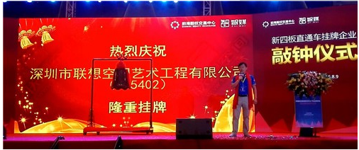 8月8日國內金融資本界領袖、互聯網行業資深實戰者、權威媒體以及近千名企業家匯聚一堂,共同見證中國新四板指數的發布。作為深圳市的重點文化企業——深圳市聯想空間藝術工程有限公司于5月16日通過審核成功掛牌。掛牌代碼:665402.
